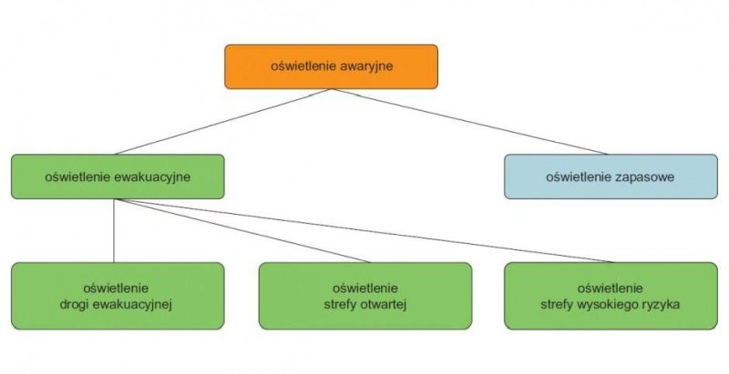Oświetlenie awaryjne, którego ogólnym celem jest zapewnienie bezpiecznego wyjścia z miejsca pobytu, podczas zaniku normalnego zasilania, powinno być zasilane z niezależnego źródła zasilania. Według normy PN-EN 1838 oświetlenie awaryjne obejmuje: awaryjne oświetlenie ewakuacyjne i oświetlenie zapasowe, (rys.1)