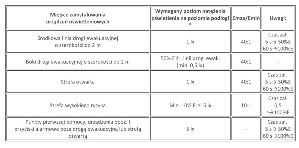 Minimalny czas stosowania oświetlenia w celu ewakuacji powinien wynosić 1 godzinę, przy czym w strefie otwartej 50% wymaganego oświetlenia powinno być wytworzone w ciągu 5 s, a pełny poziom – w ciągu 60 s.
